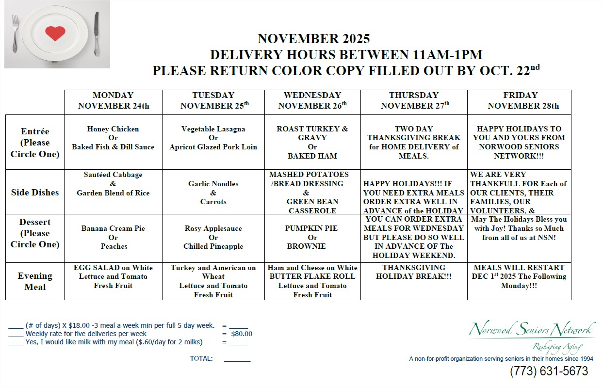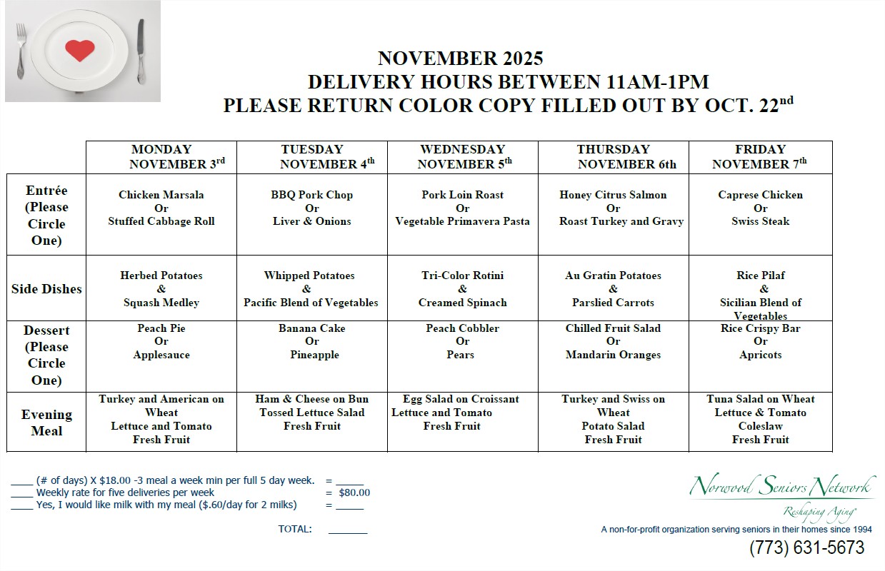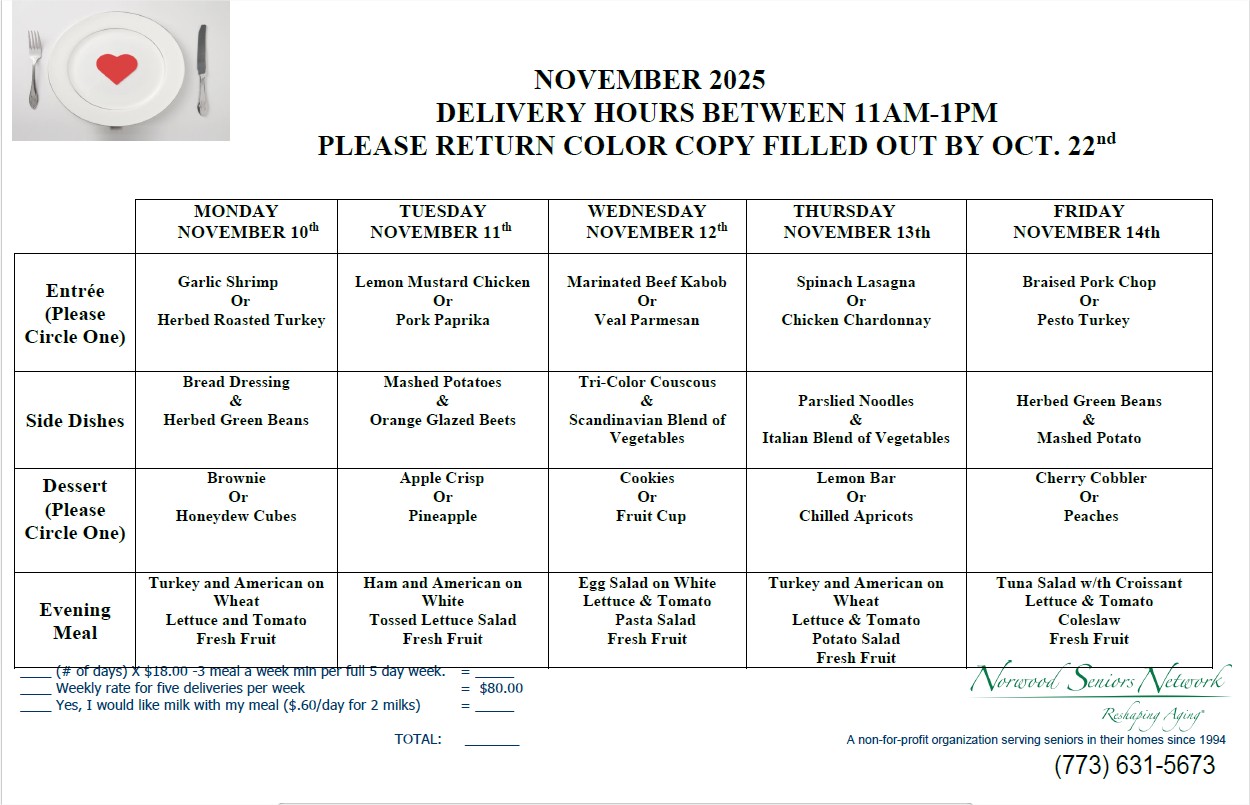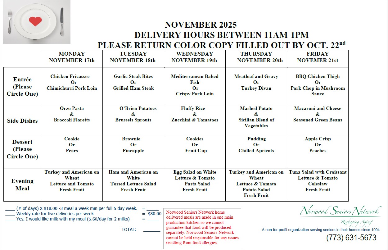 Norwood Seniors Network cannot be held responsible for any issues resulting from food allergies.